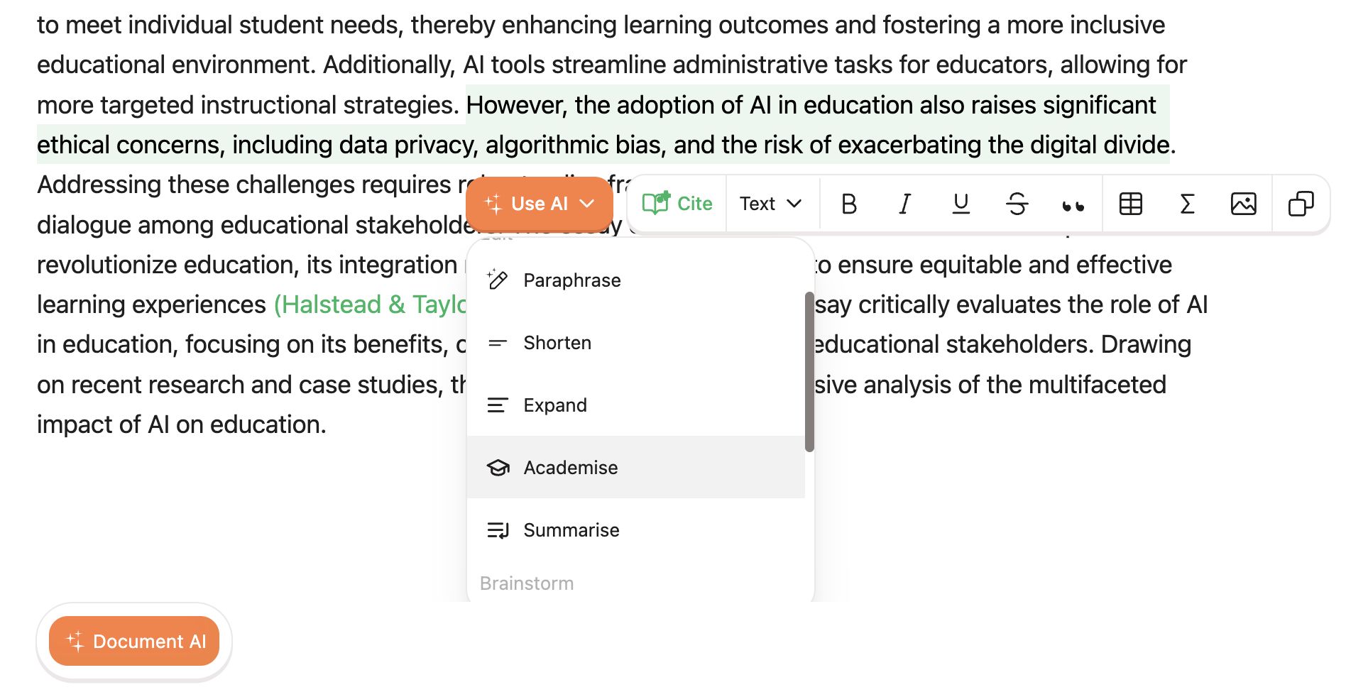 Academizing an essay involves transforming a simple text into a sophisticated scholarly piece. This requires an extensive understanding of academic writing conventions, including tone, structure, and use of formal language. Fortunately, Yomu AI excels at this task, meticulously adhering to these conventions to elevate your essay's credibility and depth.